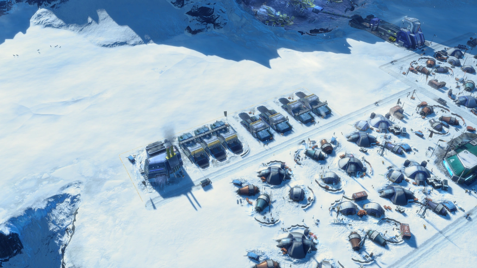 Als erstes bauen wir ein paar Polarwohnungen im Wärmekreis des Lagerhauses und verbinden sie mit letzterem. Anschließend bauen wir eine Aluminiummine und eine Druckkammer, um den Baustoff der Arktis herzustellen: Metallschaum. Um schnell an neuen Metallschaum zu kommen, erweitern wir die Mine und die Druckkammer mit Modulen. Zusätzlich können wir auf Ville Jorgensens Handelangebote zurückgreifen. Danach folgt eine Fischerei an einer Küste und eine Konservenfabrik. Die Fabriken errichten wir soweit auseinander, damit möglichst viel Bauland mit Wärme versorgt werden kann. Wir erweitern die Siedlung mit weiteren Polarwohnungen in den Wärmeradien der Fabriken.