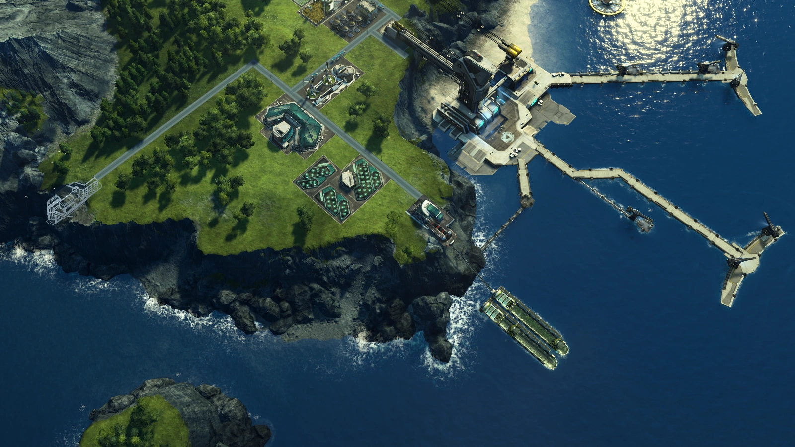 Wir finden uns in unserem neuen Sektor wieder. Mit dem Kommandoschiff, welches am Raumhafen vor Anker liegt, besiedeln wir eine der neuen Inseln, indem wir zum Lagerhausbauplatz der jeweiligen Insel fahren, den Bauplatz anklicken und das Bauland in Anspruch nehmen. Die 50.000 Credits hierfür müssen wir selbst stemmen, den Metallschaum haben wir beim Betreten des Sektors als Geschenk erhalten. Nun kann der Aufbau der Arktissiedlung beginnen.