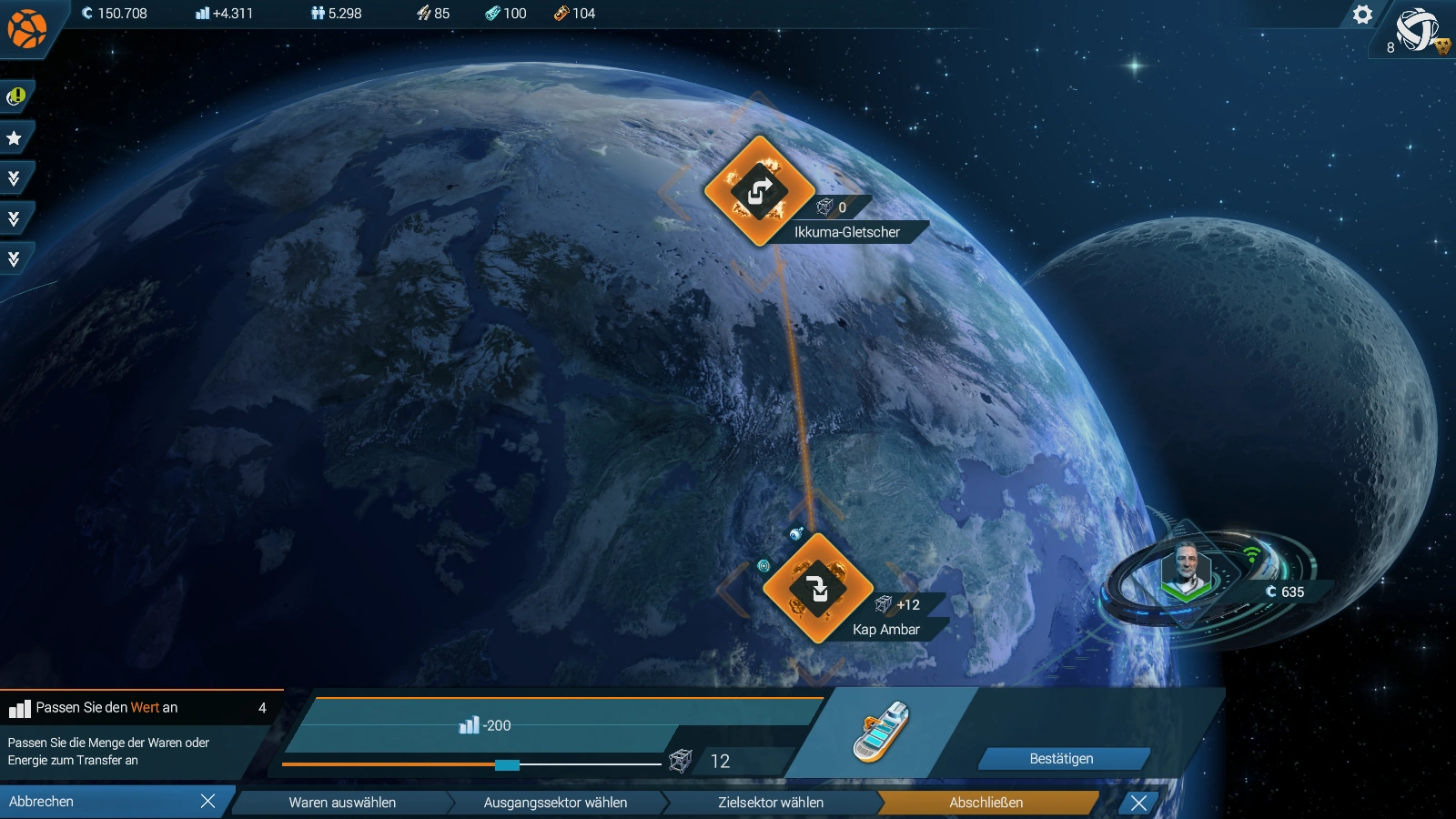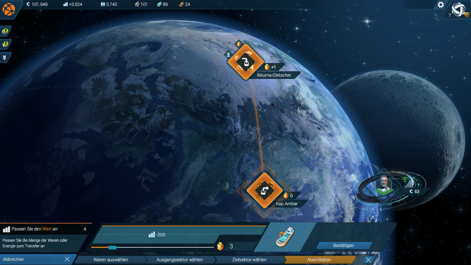 - Erstellen Sie eine Transfer-Route für Superlegieungen von <Sektor der Arktis-Region> nach <Sektor der gemäßigten Region>