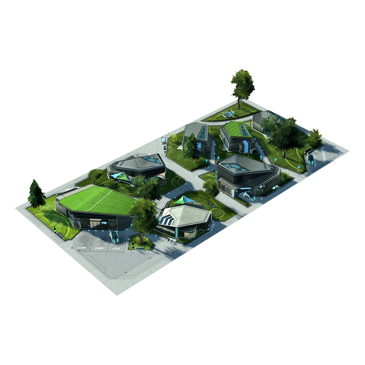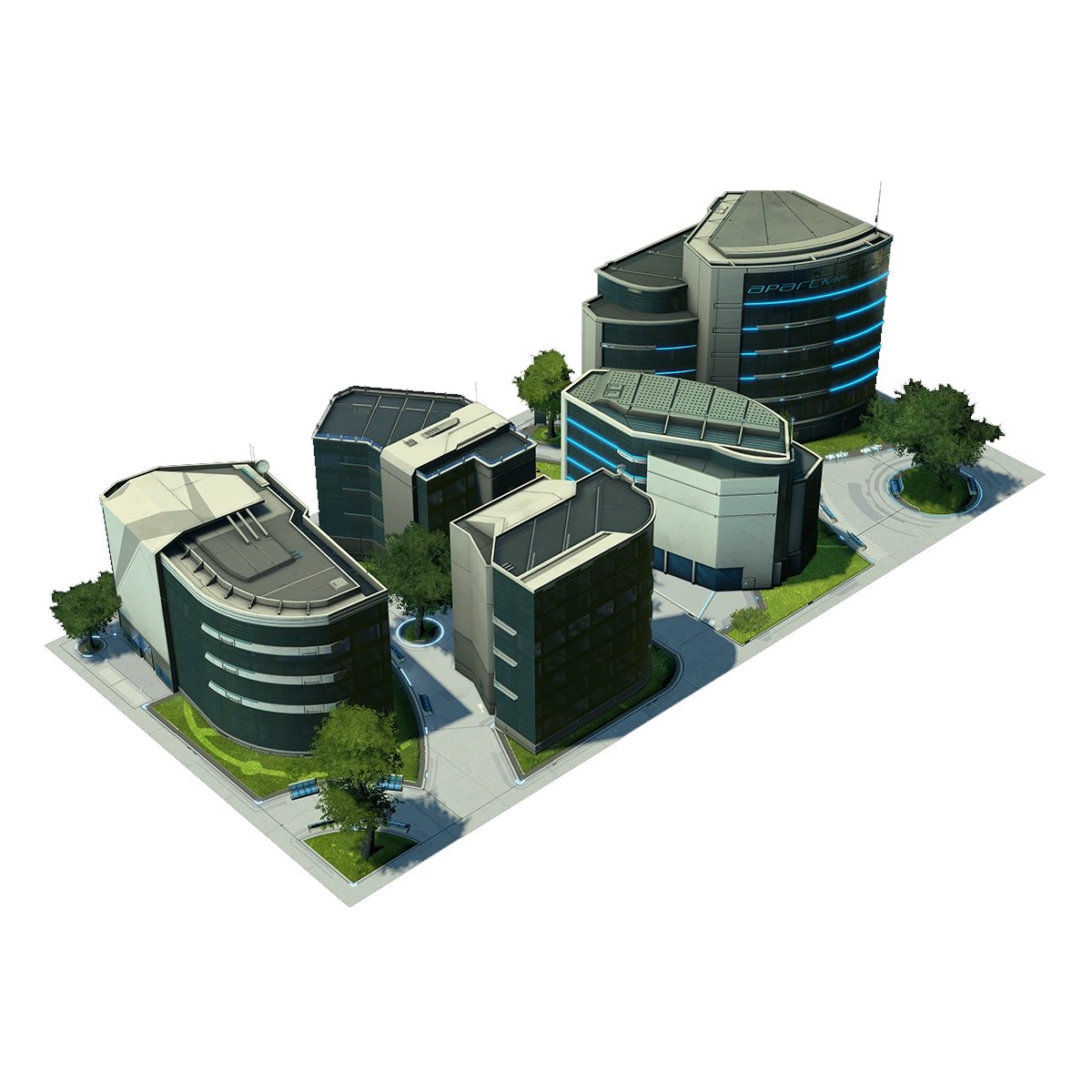 Wohngebäude in der gemäßigten Zone gibt es in zwei verschiedenen Varianten: Die normale Wohnhäuser (3x3 Kacheln) und Wohnkomplexe (6x6 Kacheln). Letztere werden allerdings erst freigeschaltet, wenn die ersten Administratoren in der Stadt leben. Zudem sind diese teurer als normale Wohnhäuser. Der Vorteil besteht darin, dass Komplexe platzsparender sind. (4x3x3=36 zu 1x6x6=36 !?)